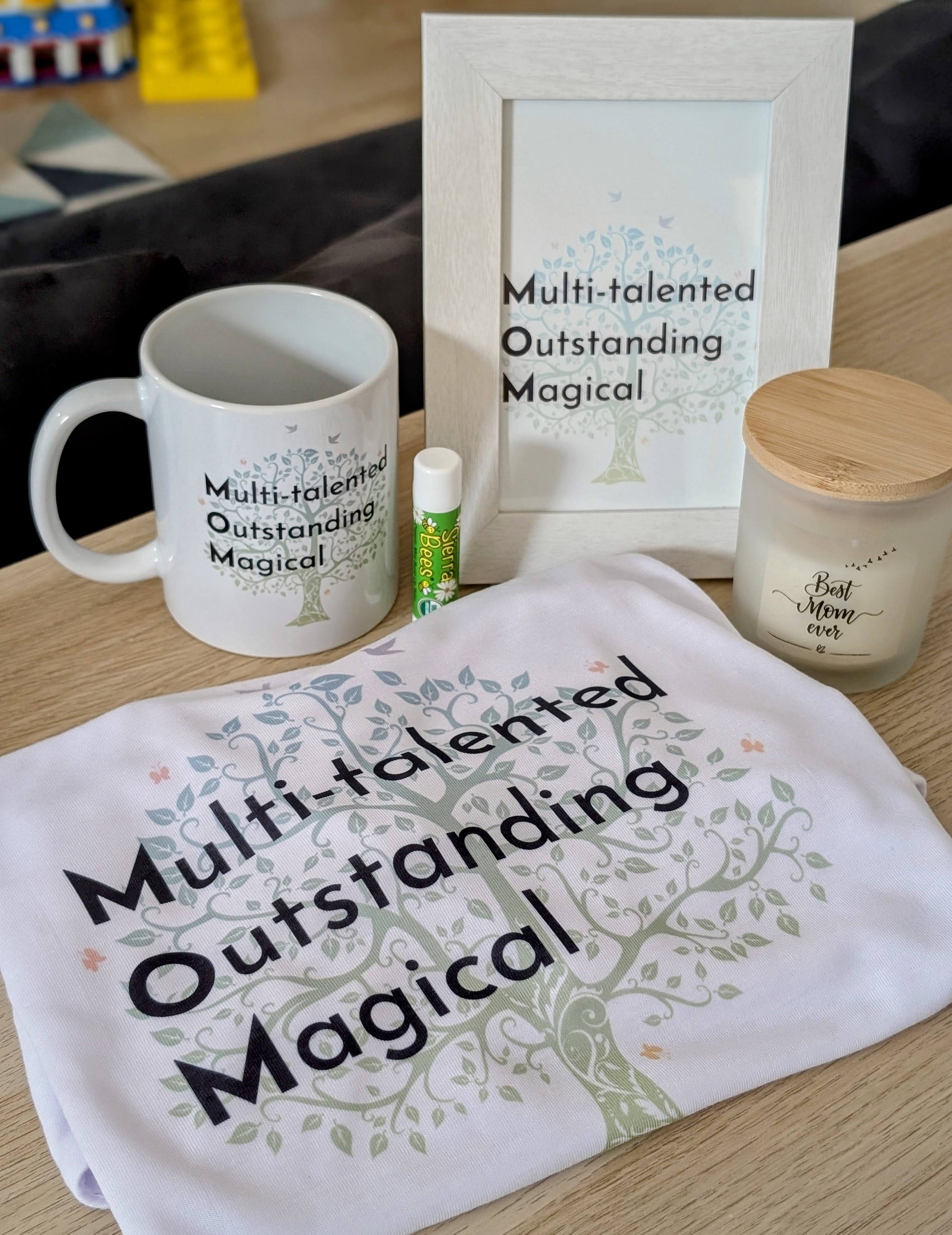 📸 A photo frame showcasing the wordplay MOM — Multi-talented. Outstanding. Magical.