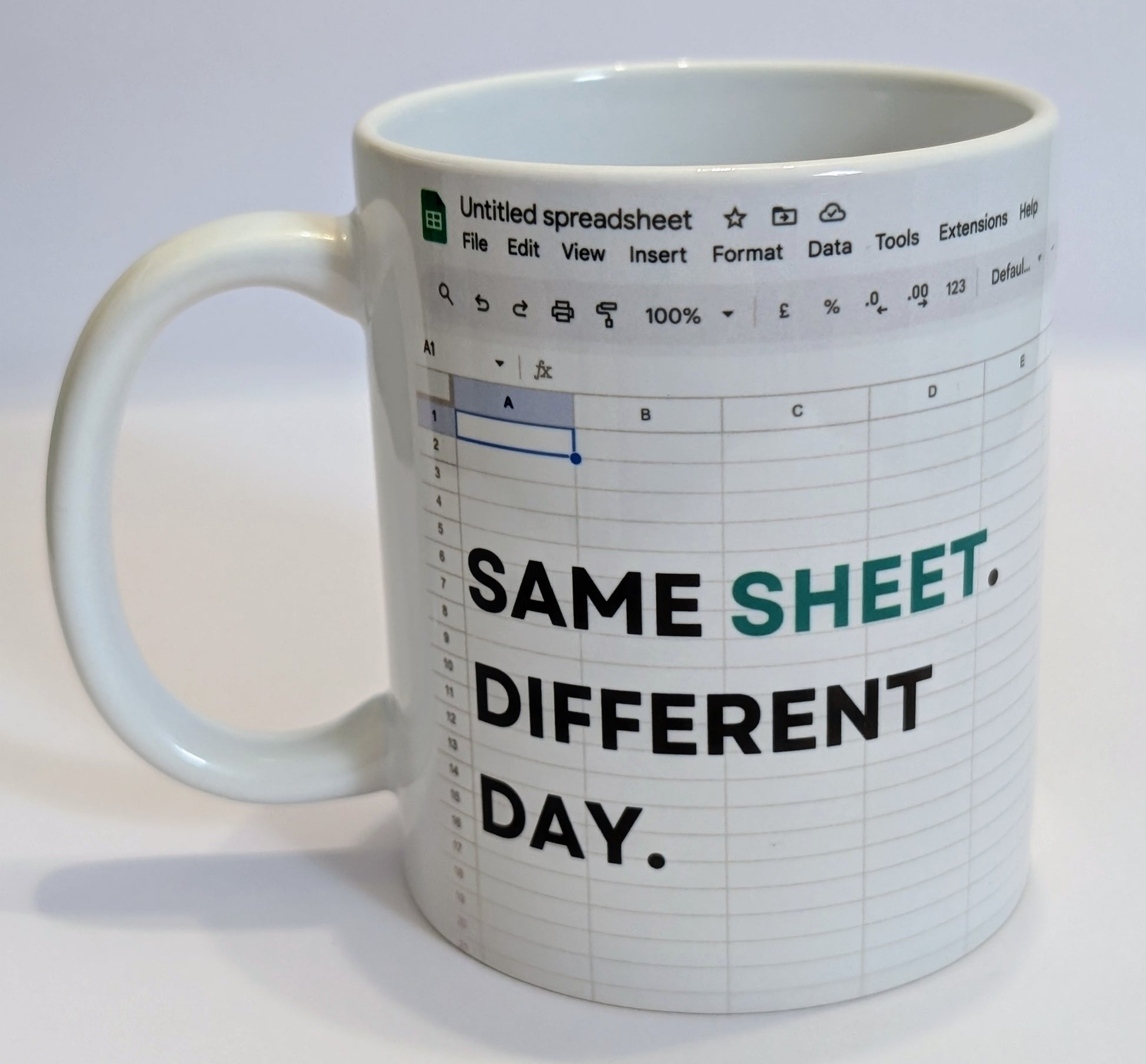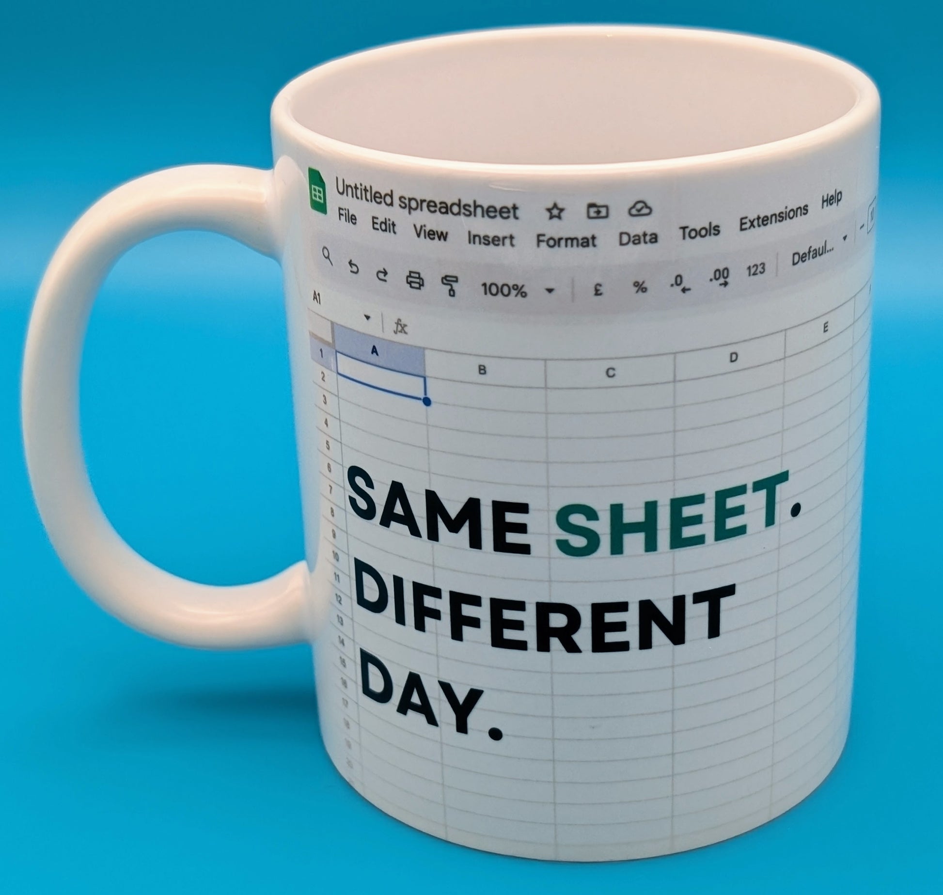 Whether you’re battling pivot tables or dragging cells like it’s cardio, this mug is your caffeine-fuelled sidekick. Because let’s face it — it’s always the same sheet, just a different day.